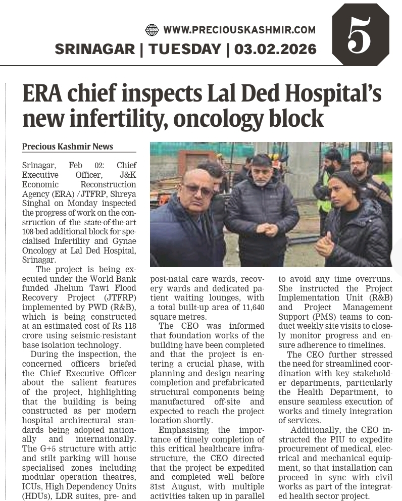 | ERA Chief inspects Lal Ded Hospital's new infertility , oncology block (Precious Kashmir News) |