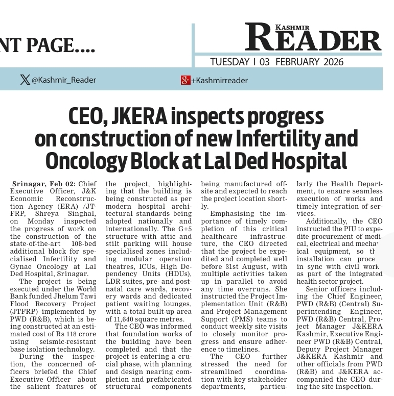 | CEO JKERA inspects progress on Construction of new Infertility and Oncology block at Lal Ded Hospital (Kashmir Reader) |