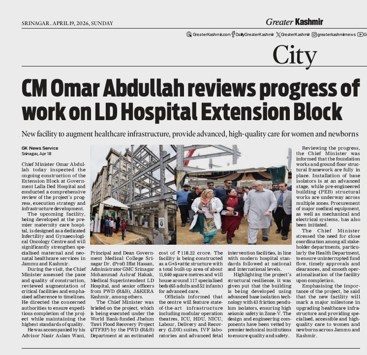 | CM Omar Abdullah reviews progress of work on LD Hospital Extension Block (Greater Kashmir) |